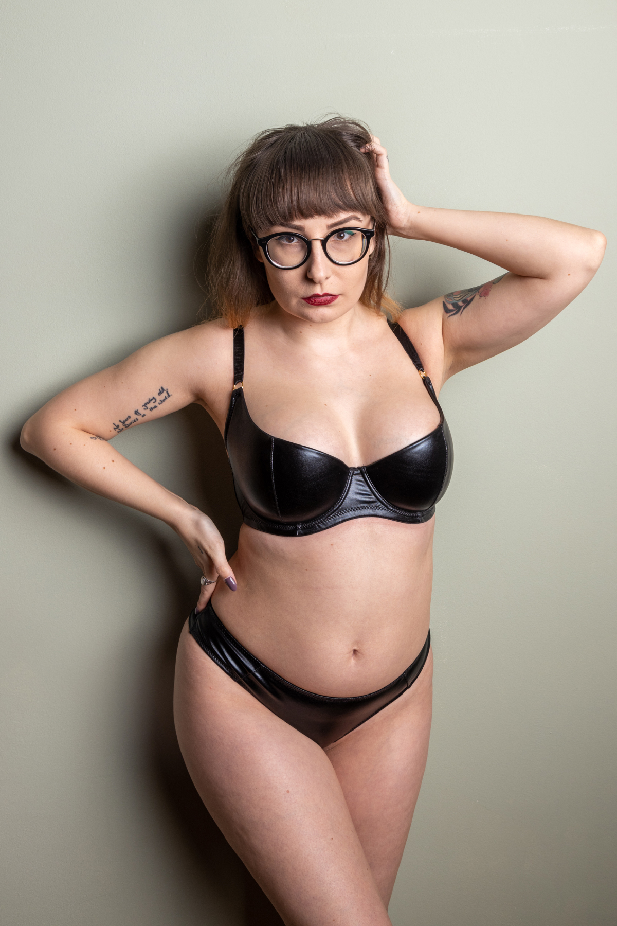 the brief is a perfect fit, sitting low on the hips and giving a cheeky brazilian shape at the back. it’s a little less covering than a standard brazilian knicker, hence the term ‘brazilian thong‘, which i think might just be my new favourite! it is entirely made from the soft faux leather fabric, with a brushed lining that’s comfortable on the skin. the size small is spot on for my 8-10 UK dress size.